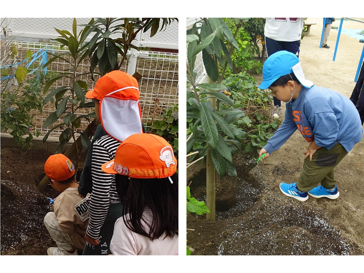 今回植樹したのは「ビワ」。植樹の前に、苗木を準備いただいた阪神園芸の皆さんから、「ビワ」がいつどんな葉や花や実がつくのかなどを紙芝居で教えていただきました。