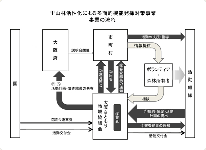 このため、林野庁が公益財団法人 大阪みどりのトラスト協会を通じて、活動団体に生物多様性の保全活動を目的とし、平成25年度から森林・山村多面的機能発揮対策交付金を交付しています。